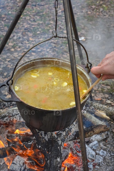 Приготовление пищи в горшке на костре, приготовление пищи в лагере, горшок с горячей едой
