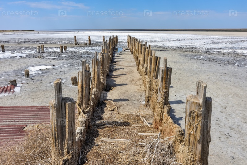 Потрясающая белая соляная пустыня или соляное озеро. остатки деревянного здания в соленом озере. высохшее соленое озеро, изъеденное солью здание, гнилое деревянное здание