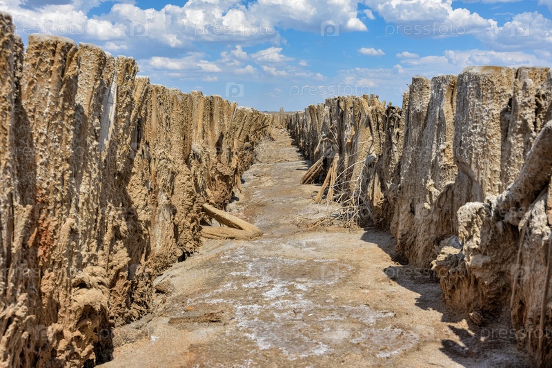 Потрясающая белая соляная пустыня или соляное озеро. остатки деревянного здания в соленом озере. высохшее соленое озеро, изъеденное солью здание, гнилое деревянное здание