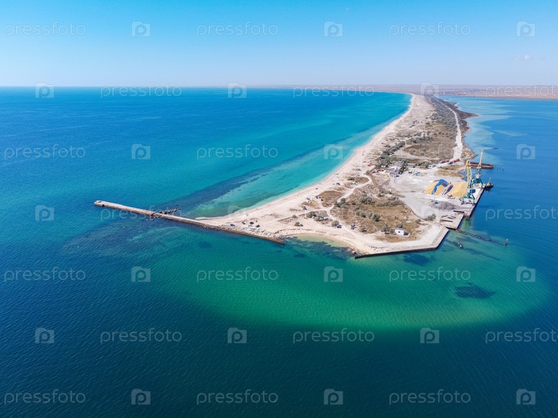 Вид с воздуха на тропический песчаный пляж, разделяющий экзотическое бирюзовое море и озеро. песчаная коса в море сверху, полет над песчаной косой и разноцветное море