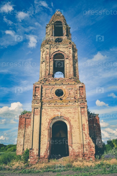 Разрушенная колокольня, заросшая травой на фоне облачного неба, вид снизу