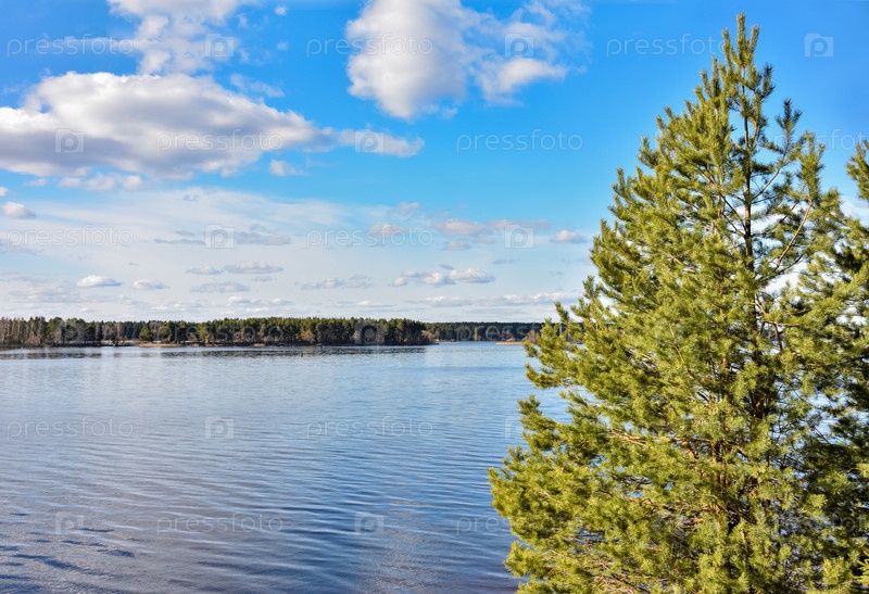 Молодая зелень ели на фоне реки и голубого неба