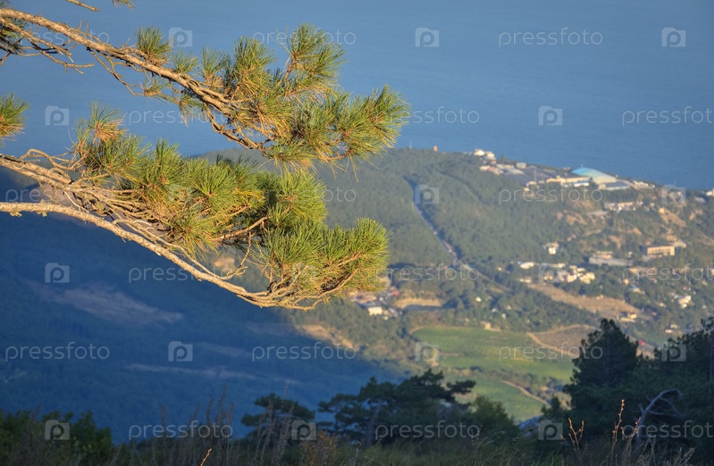 Сосна на скале с видом на панораму города, пляжа и Черного моря на заднем плане вниз. Ай-Петри, Крым