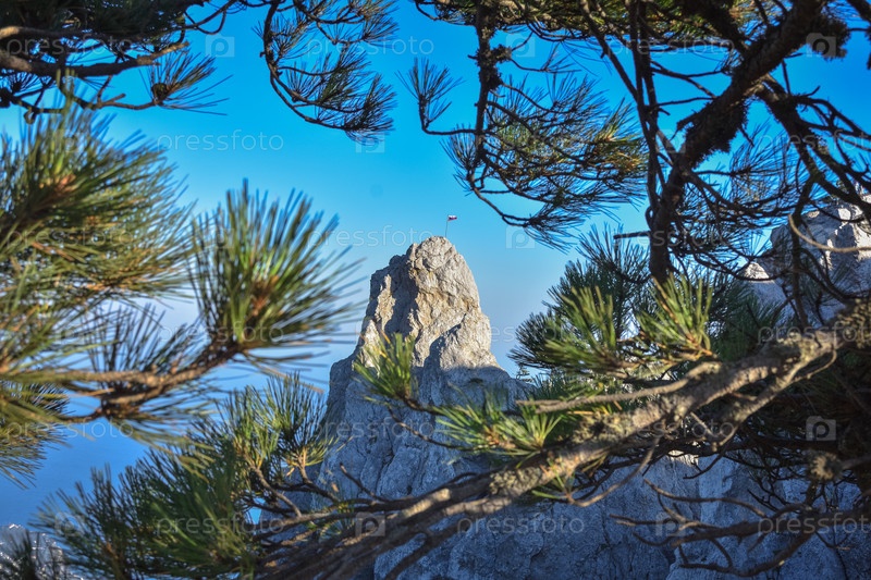 Сосна на скале с видом на панораму города, пляжа и Черного моря на заднем плане вниз. Ай-Петри, Крым. Утес сосновой ветки с видом на красивый стиль. Вид сверху