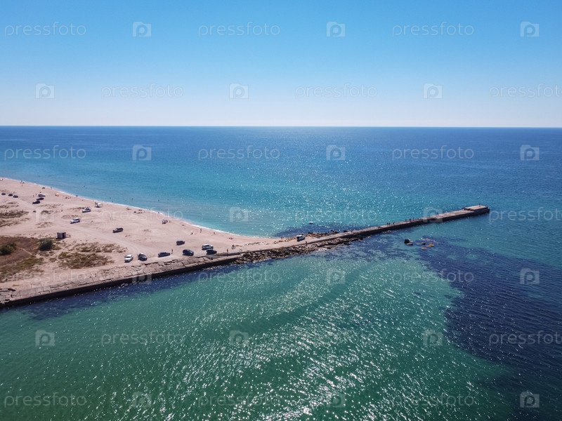 Вид с воздуха на тропический песчаный пляж, разделяющий экзотическое бирюзовое море и озеро. песчаная коса в море сверху, полет над песчаной косой и разноцветное море