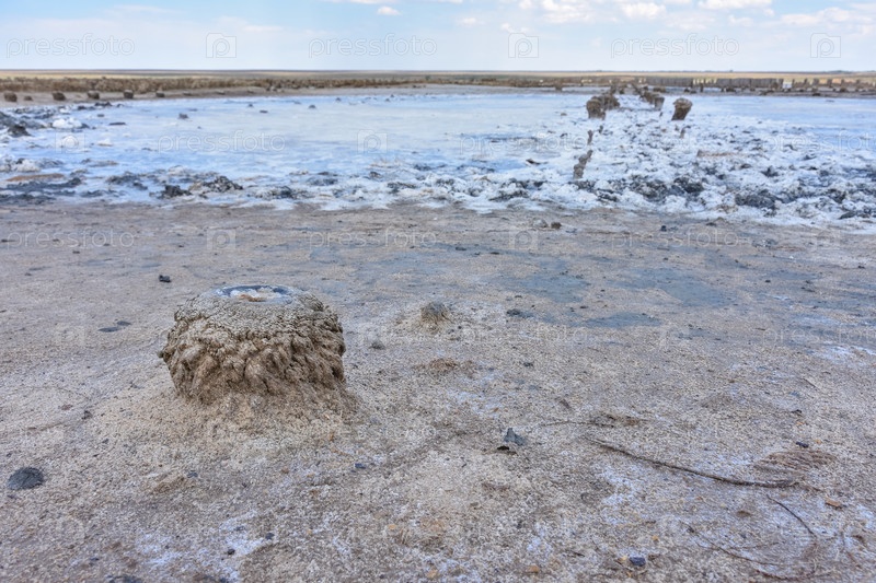 Пейзаж пустынного соленого озера. Текстура соляных образований на переднем плане. поверхность соленого озера, сухое соленое озеро, белое соленое озеро