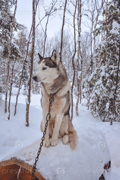 Хаски сидит на будке с цепью в заснеженном лесу