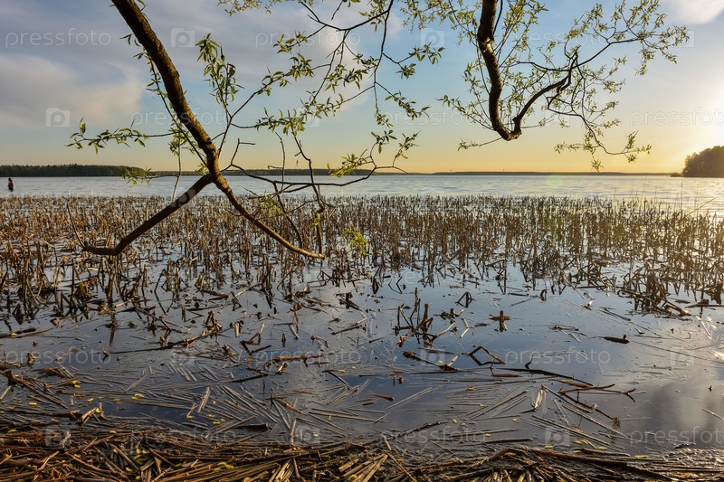 Дерево сбрасывает ветки в реку на закате