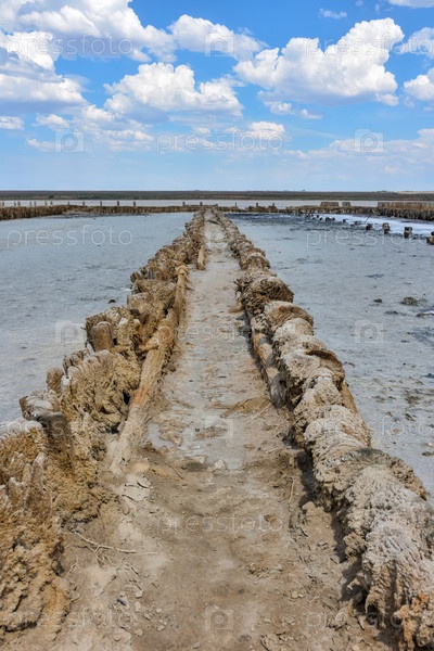 Потрясающая белая соляная пустыня или соляное озеро. остатки деревянного здания в соленом озере. высохшее соленое озеро, изъеденное солью здание, гнилое деревянное здание