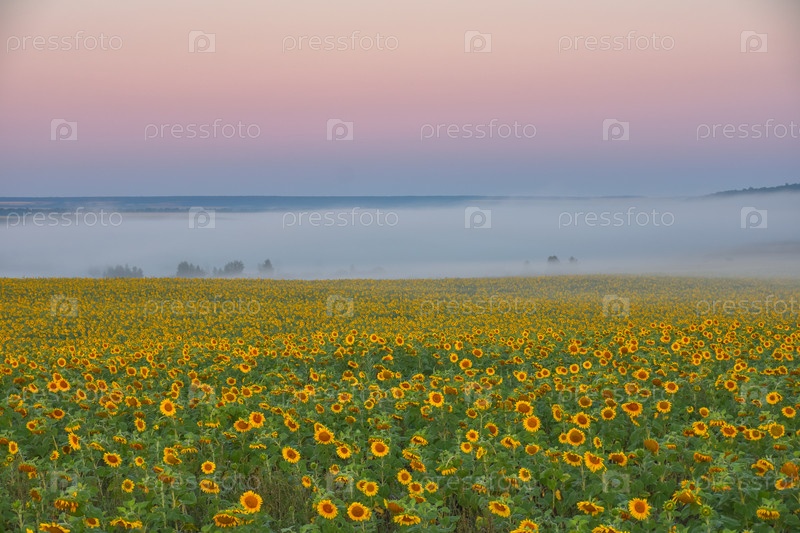 Поле подсолнухов в утреннем тумане, луг в тумане, утренний туман в поле
