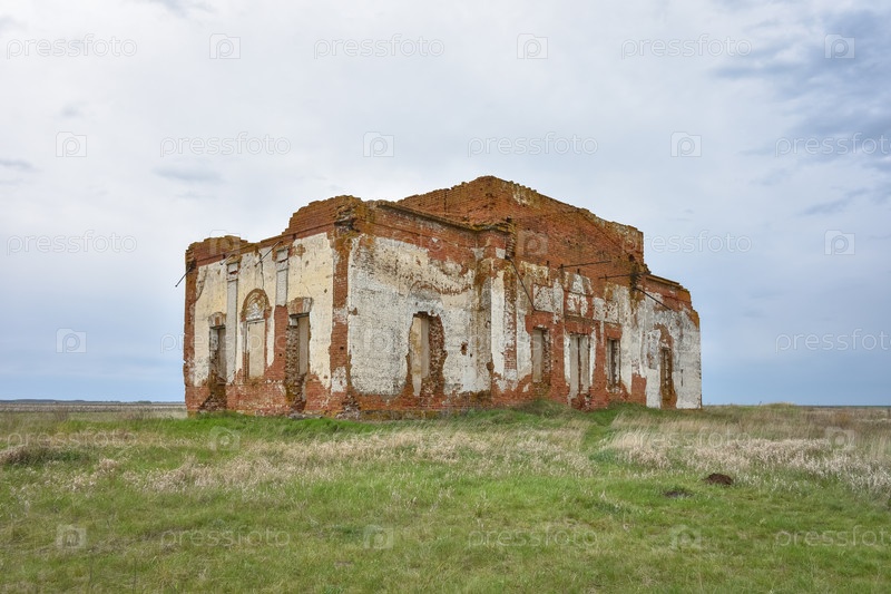 Разрушенный кирпичный храм в поле, заброшенная церковь
