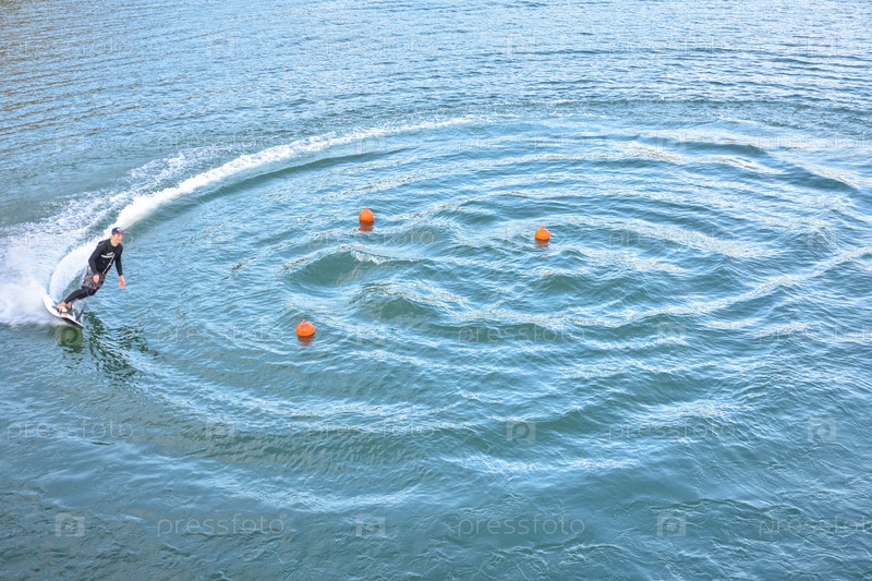 Участник Motosurf вступает в поворот при скорости, образуя много распылений. реактивный серфинг на воде, мужчина катается на реактивной доске для сёрфинга. серфер в движении, летний спорт