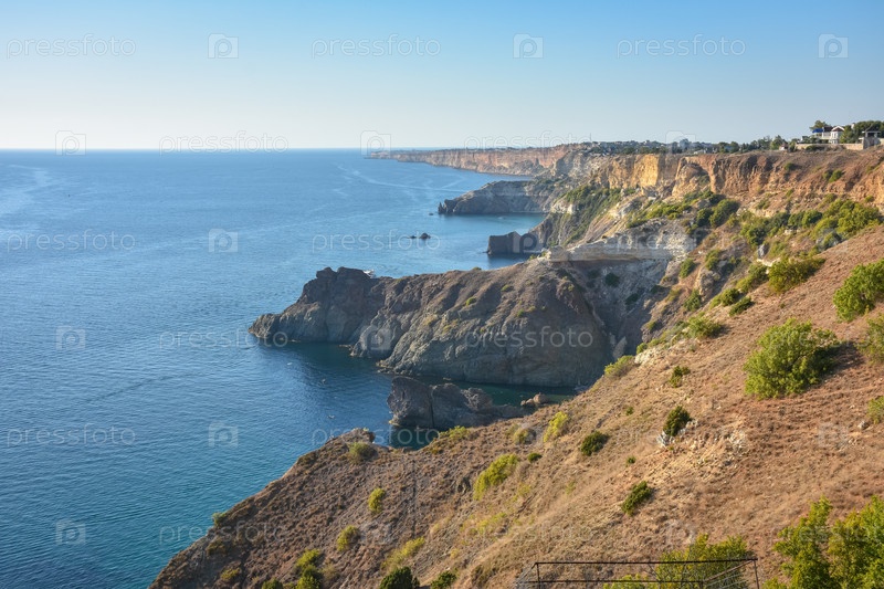 Мыс Фиолент. Прекрасные виды на побережье Черного моря на мысе Фиолент летом в ясную погоду. Вид с воздуха на красивое морское побережье с бирюзовой водой и скалами