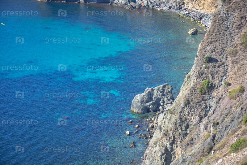 Мыс Фиолент. Прекрасные виды на побережье Черного моря на мысе Фиолент летом в ясную погоду. Вид с воздуха на красивое морское побережье с бирюзовой водой и скалами