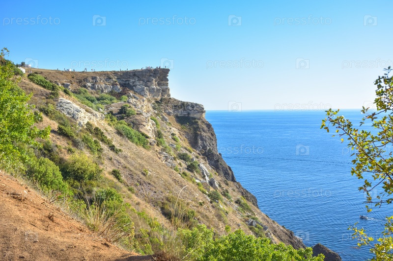Мыс Фиолент. Прекрасные виды на побережье Черного моря на мысе Фиолент летом в ясную погоду. Вид с воздуха на красивое морское побережье с бирюзовой водой и скалами