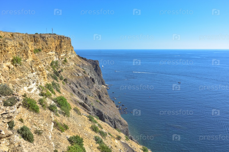 Мыс Фиолент. Прекрасные виды на побережье Черного моря на мысе Фиолент летом в ясную погоду. Вид с воздуха на красивое морское побережье с бирюзовой водой и скалами