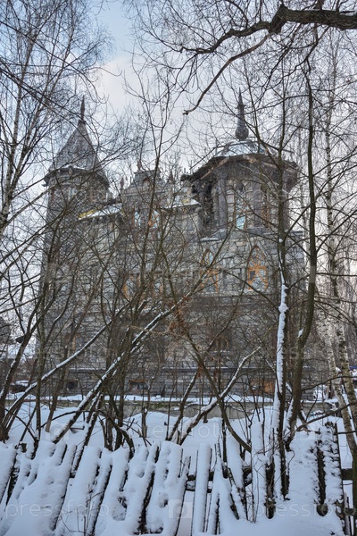 Готический замок зимой, вид снаружи, на фоне неба, зимние деревья