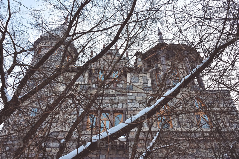 Готический замок зимой, вид снаружи, на фоне неба, зимние деревья