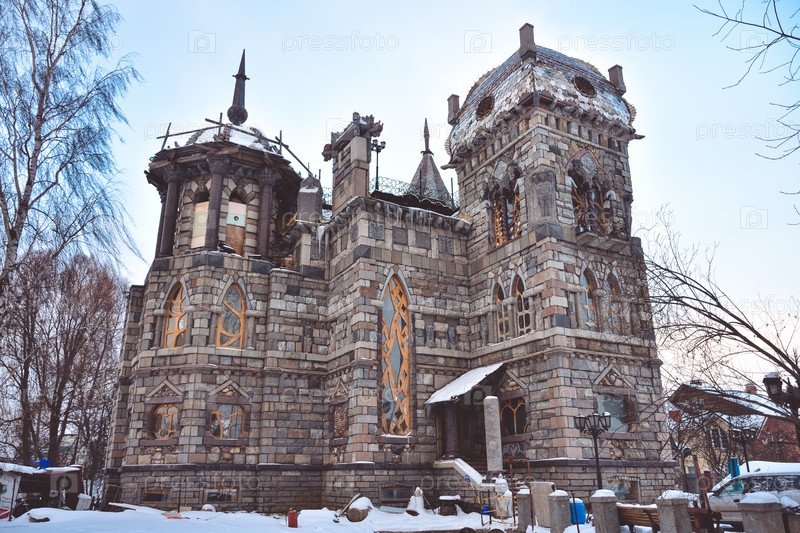 Готический замок зимой, вид снаружи, на фоне неба, зимние деревья