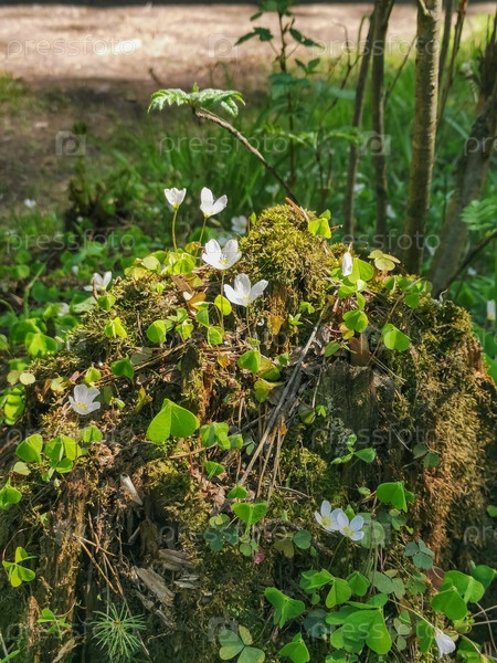 Пень заросший цветами в лесу весной, белые весенние цветы на пне