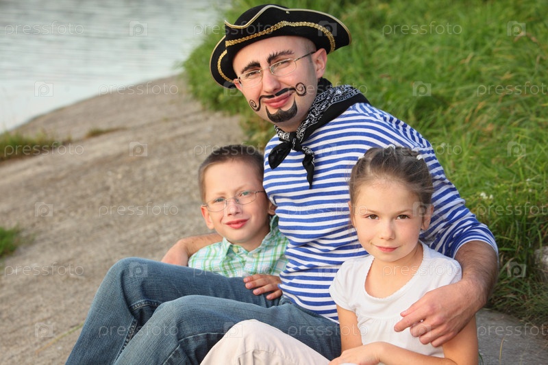 Отец в пиратском костюме с сыном и дочерью