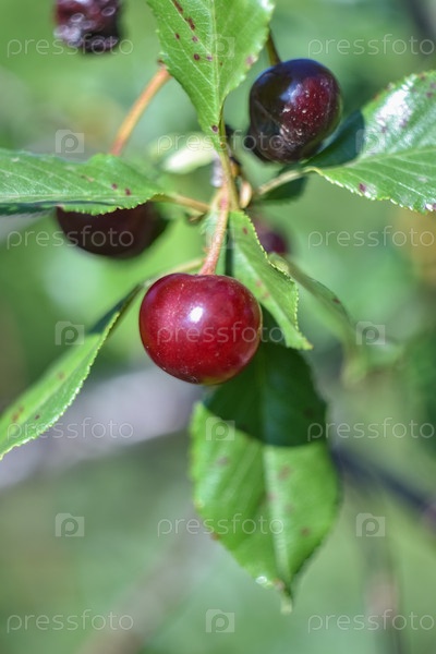 Крупный план вишни, красная ягода в саду, вишня на ветке