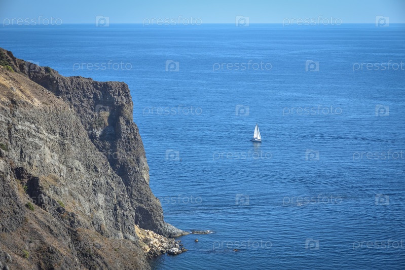 Мыс Фиолент. Прекрасные виды на побережье Черного моря на мысе Фиолент летом в ясную погоду. Вид с воздуха на красивое морское побережье с бирюзовой водой и скалами