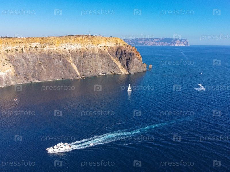 Мыс Фиолент. Прекрасные виды на побережье Черного моря на мысе Фиолент летом в ясную погоду. Вид с воздуха на красивое морское побережье с бирюзовой водой и скалами