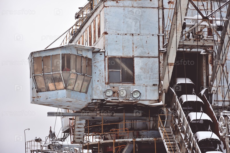 Заброшенный гигантский роторный экскаватор стоит в поле зимой