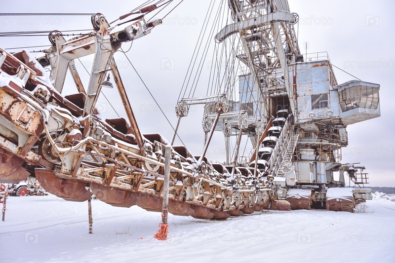 Заброшенный гигантский роторный экскаватор стоит в поле зимой