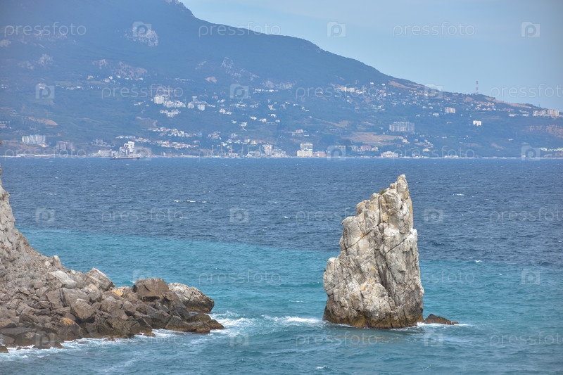 Кусок скалы у моря у берега, вид на прибрежные скалы возле замка Ласточкино Гнездо в Крыму, отдельно стоящий большой кусок скалы посередине, береговая линия слева, вид на море