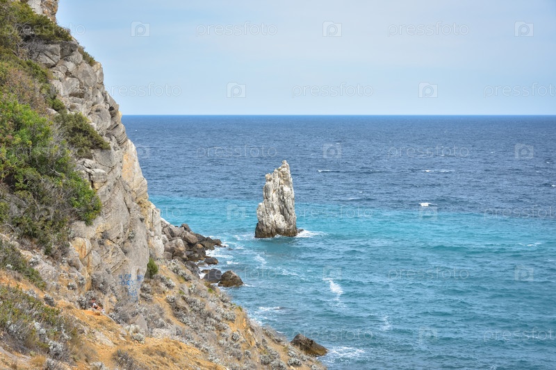 Кусок скалы у моря у берега, вид на прибрежные скалы возле замка Ласточкино Гнездо в Крыму, отдельно стоящий большой кусок скалы посередине, береговая линия слева, вид на море