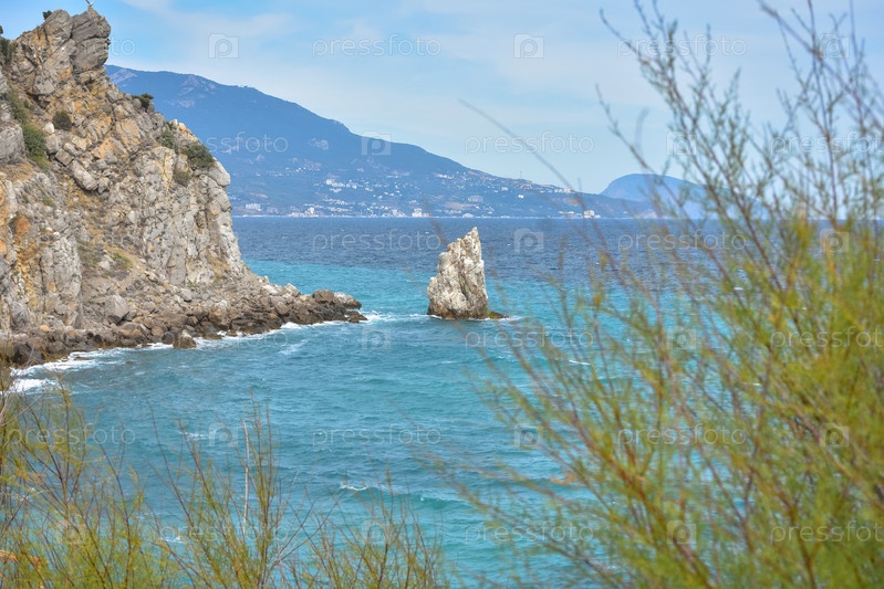 Кусок скалы у моря у берега, вид на прибрежные скалы возле замка Ласточкино Гнездо в Крыму, отдельно стоящий большой кусок скалы посередине, береговая линия слева, вид на море