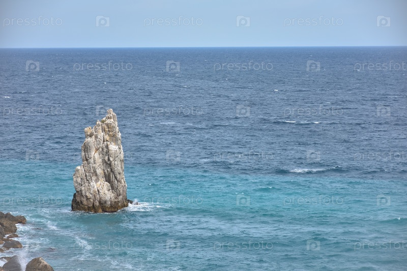 Кусок скалы у моря у берега, вид на прибрежные скалы возле замка Ласточкино Гнездо в Крыму, отдельно стоящий большой кусок скалы посередине, береговая линия слева, вид на море