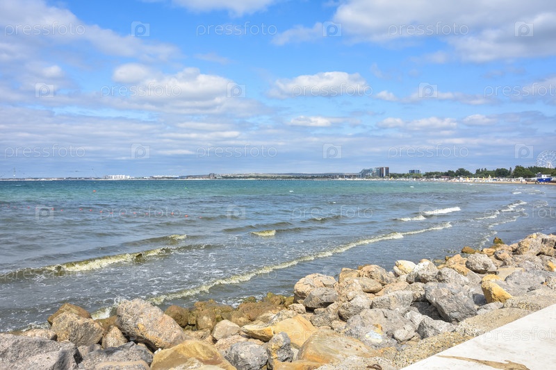 Красивый живописный морской пейзаж Черного моря, Анапа, Россия. Каменистый пляж Черного моря. морской пейзаж, вид на море с берега