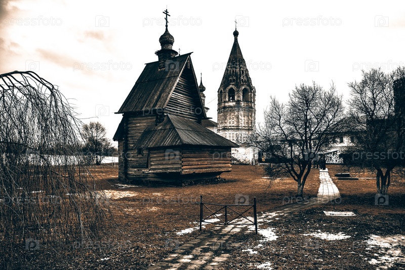 Юрьев-Польский / Россия - 7 марта 2020 г.: деревянная Георгиевская церковь из села Егорье Михайло-Архангельского монастыря