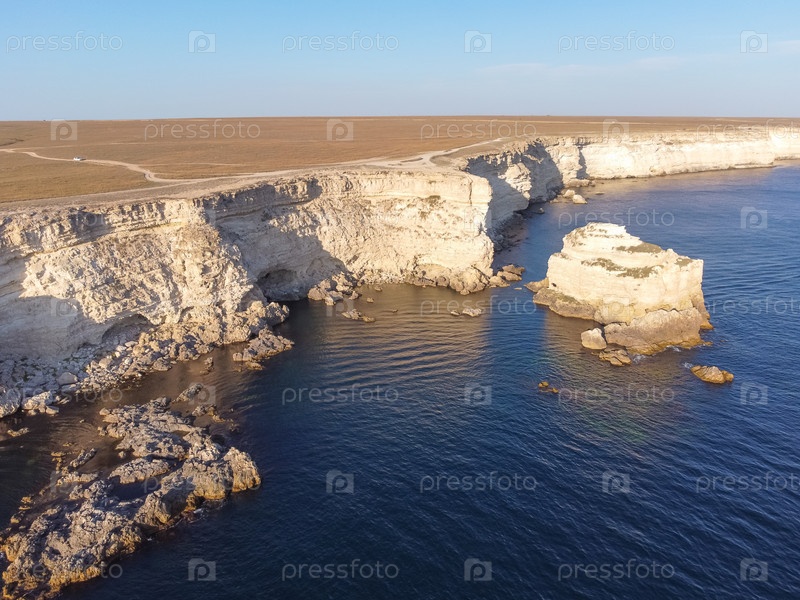 Мыс Тарханкут с бирюзовой водой на западном побережье полуострова Крым. Летний морской пейзаж, известное туристическое направление. Живописный морской пейзаж, пляж побережья Крыма Черное море Ялтинские горы. Скалистый утес в море