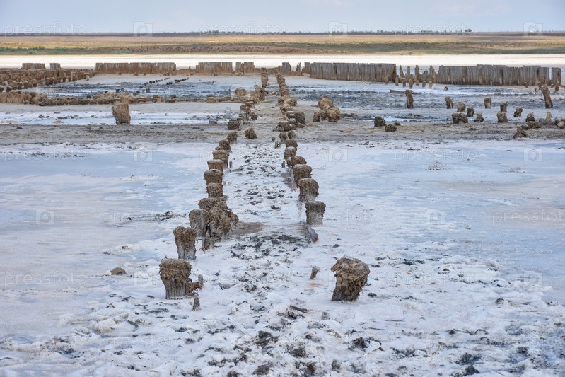 Потрясающая белая соляная пустыня или соляное озеро. остатки деревянного здания в соленом озере. высохшее соленое озеро, изъеденное солью здание, гнилое деревянное здание