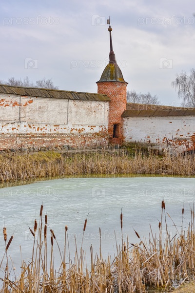 Юрьев-Польский / Россия - 7 марта 2020 г.: Стены и пруд в Михайло-Архангельском монастыре
