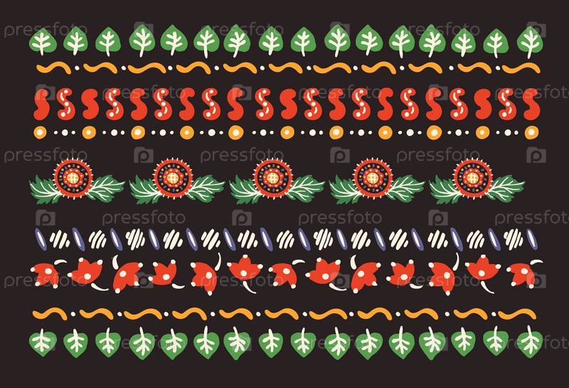 Набор этнических элементов. Бордюр представляет собой полосу с цветами, листьями, ветками, вензелями. Народная вышивка. Славянский, украинский, русский мотив. Хохлома, матрешка, дымковская игрушка. Мексиканский, индийский, цыганский ковер. Вязаное кружево