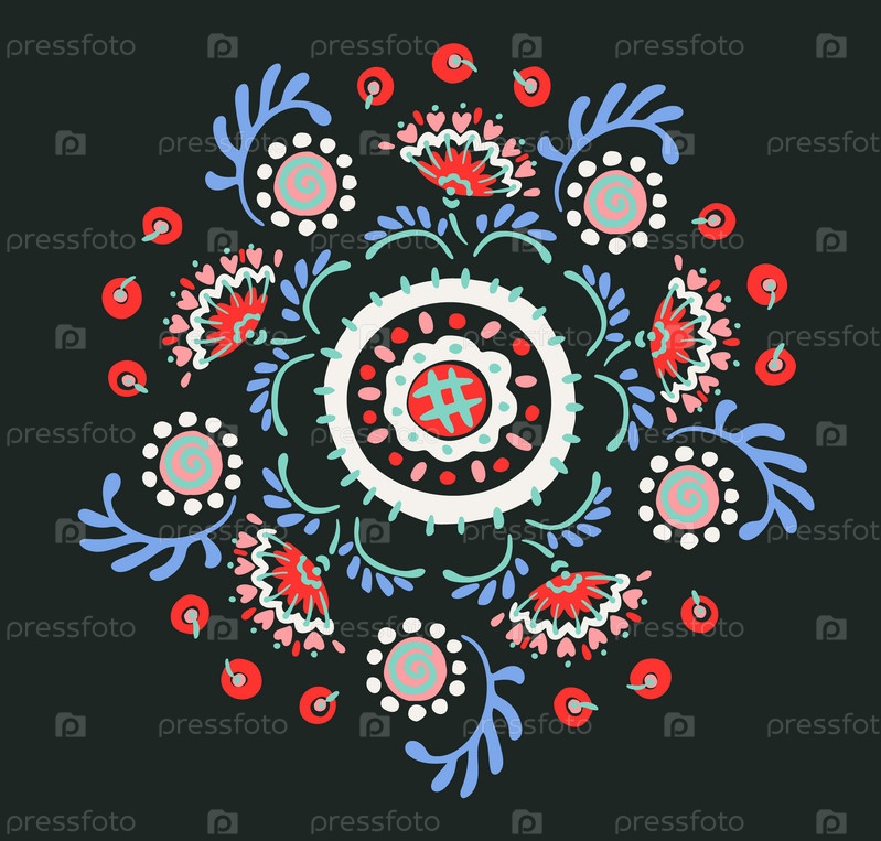 Набор этнических элементов. Бордюр представляет собой полосу с цветами, листьями, ветками, вензелями. Народная вышивка. Славянский, украинский, русский мотив. Хохлома, матрешка, дымковская игрушка. Мексиканский, индийский, цыганский ковер. Вязаное кружево
