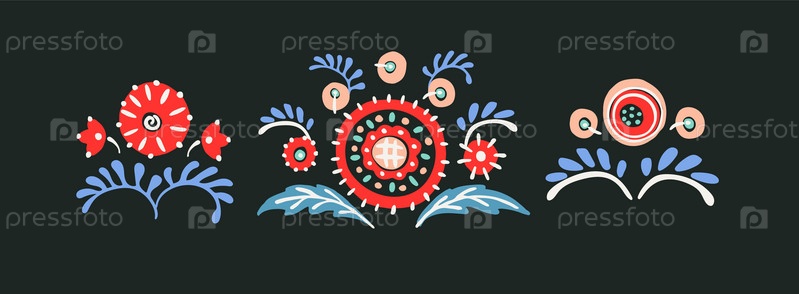 Набор этнических элементов. Бордюр представляет собой полосу с цветами, листьями, ветками, вензелями. Народная вышивка. Славянский, украинский, русский мотив. Хохлома, матрешка, дымковская игрушка. Мексиканский, индийский, цыганский ковер. Вязаное кружево