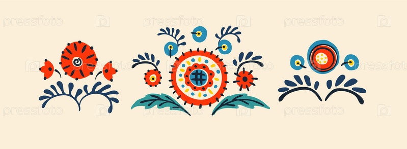 Набор этнических элементов. Бордюр представляет собой полосу с цветами, листьями, ветками, вензелями. Народная вышивка. Славянский, украинский, русский мотив. Хохлома, матрешка, дымковская игрушка. Мексиканский, индийский, цыганский ковер. Вязаное кружево