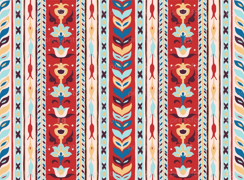 Геометрический дамасский орнамент. Икат границы. Этническая вышивка с листьями и монограммами. Племенная векторная текстура. Бесшовный народный узор в ацтекском стиле. Индийский, скандинавский, цыганский, мексиканский, африканский ковер