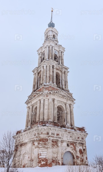 Колокольня посреди замерзшего озера, крупный план снизу
