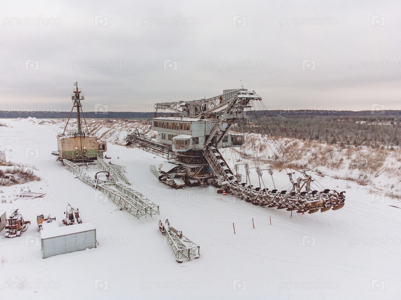 Заброшенный гигантский роторный экскаватор стоит в поле зимой