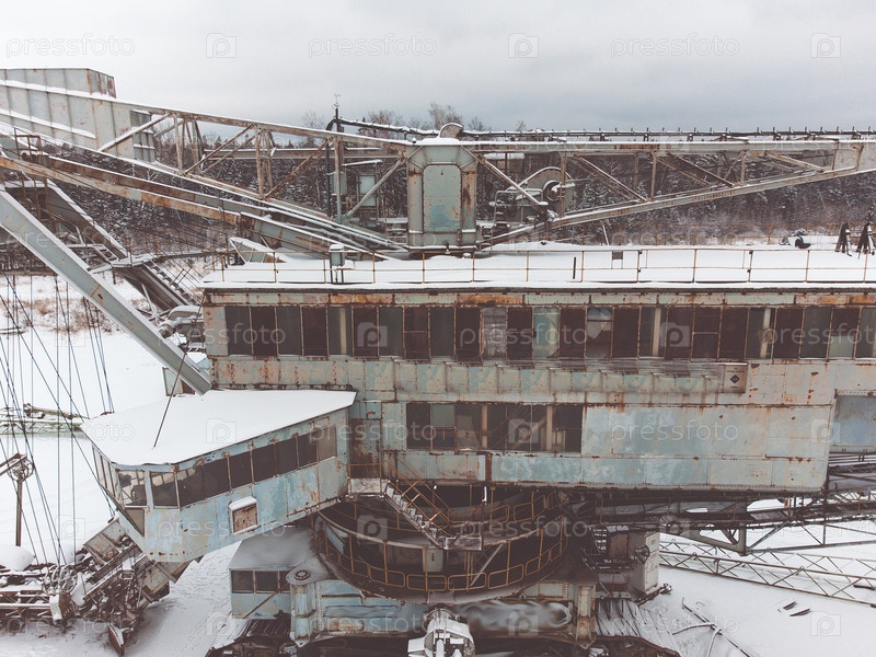 Заброшенный гигантский роторный экскаватор стоит в поле зимой