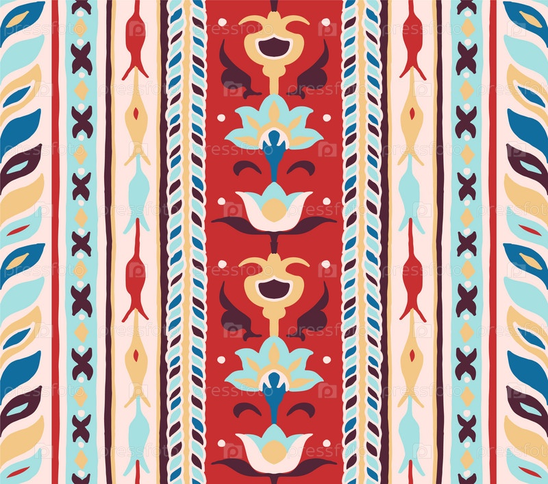 Геометрический дамасский орнамент. Икат границы. Этническая вышивка с листьями и монограммами. Племенная векторная текстура. Бесшовный народный узор в ацтекском стиле. Индийский, скандинавский, цыганский, мексиканский, африканский ковер