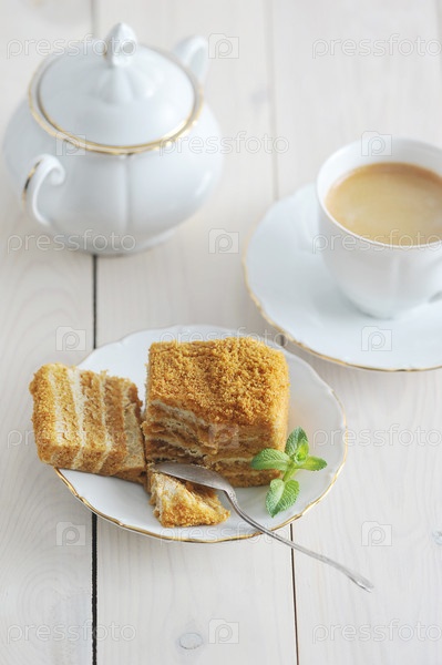 Медовик и листик мяты на блюдце с золотым ободком