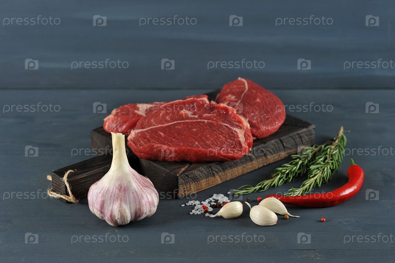 Сырые стейки из говядины на деревянной доске